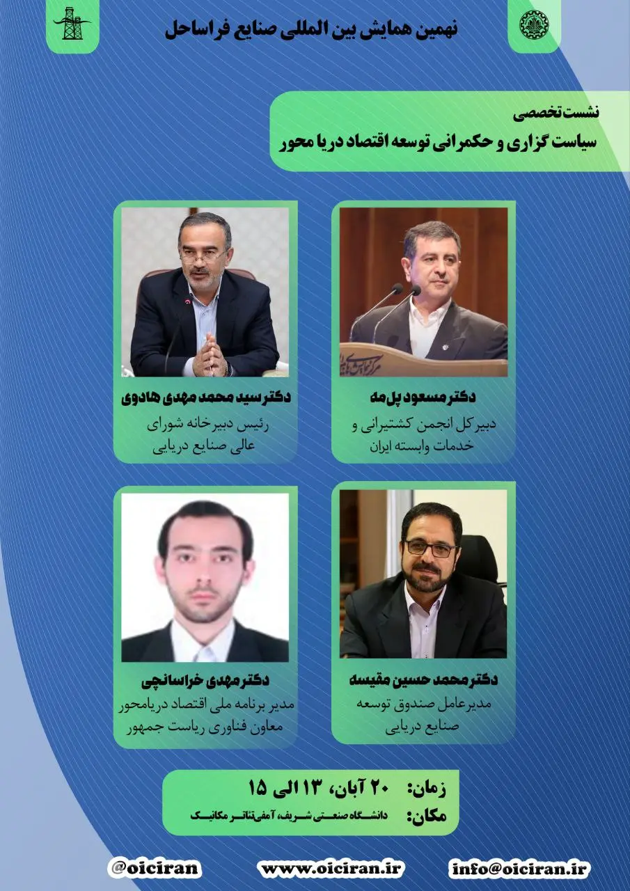 همزمان با نهمین همایش بین‌المللی صنایع فراساحل نخستین نشست تخصصی با محوریت «سیاست گذاری و حکمرانی توسعه اقتصاد دریامحور» روز سه شنبه ۲۰ آبان ماه از ساعت ۱۳ تا ۱۵ در سالن آمفی تئاتر مکانیک دانشگاه صنعتی شریف برگزار می شود.