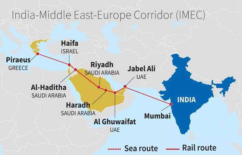 کریدور اقتصادی هند-خاورمیانه-اروپا (آیمک) با هدف افزایش ارتباطات تجاری و انرژی در سراسر قارهها طراحی شده است. این پروژه شامل دو مسیر مرتبط است؛ کریدور شرقی هند را از طریق شبکههای دریایی و ریلی از طریق امارات و عربستان به خلیج فارس متصل میکند و کریدور شمالی نیز عربستان را از طریق اردن و اسرائیل به بنادر اروپایی مانند پیرائوس در یونان متصل میکند. هدف این مسیرها ایجاد یک زنجیره لجستیک روان با اتصال بنادر، افزایش اتصال دیجیتال و اتصال خطوط لوله انرژی در سه قاره بود.